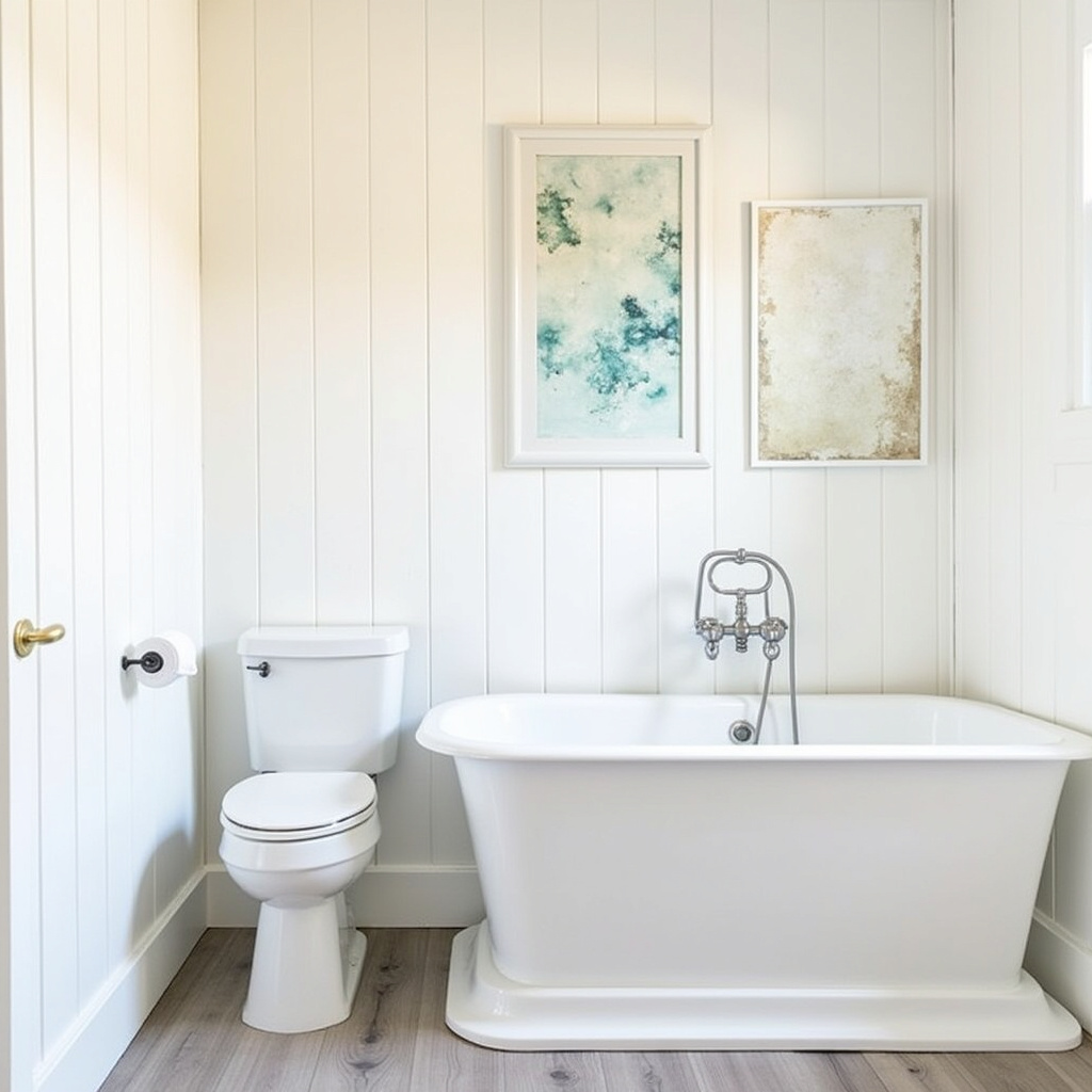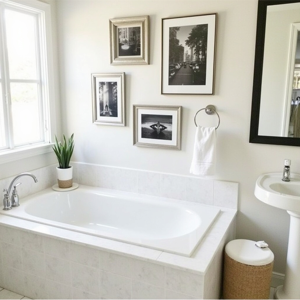 Turn your half bath into a mini art gallery. A curated mix of prints or photographs adds visual interest without taking up floor space.