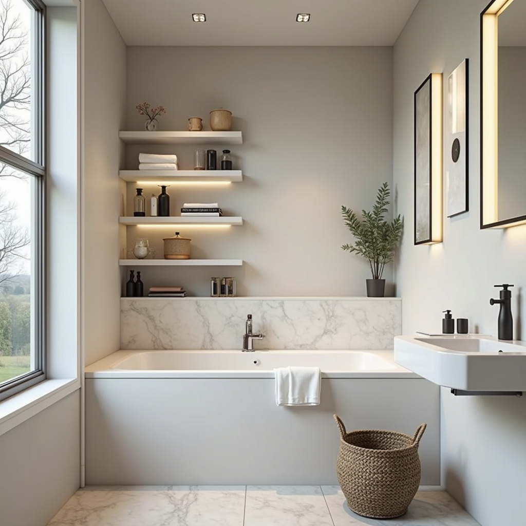 Open shelves provide storage without making the room feel closed in. Use them for towels, plants, or decorative accents.